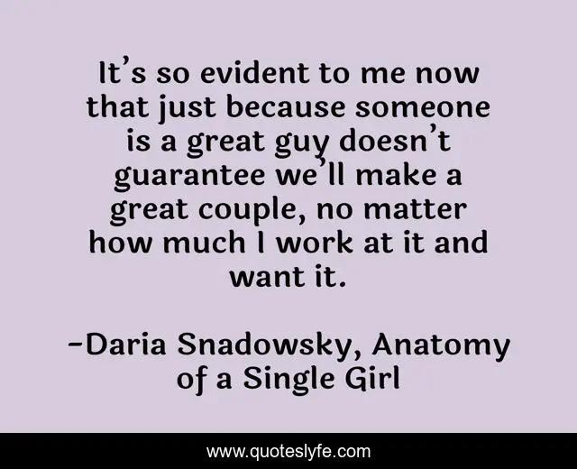 This page presents the quote "It’s so evident to me now that just because someone is a great guy doesn’t guarantee we’ll make a great couple, no matter how much I work at it and want it.". Author of this quote is Daria Snadowsky, Anatomy of a Single Girl. This quote is about relationships, dating,.