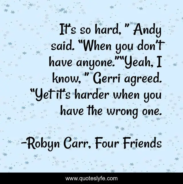 This page presents the quote "It’s so hard, ” Andy said. “When you don’t have anyone.”“Yeah, I know, ” Gerri agreed. “Yet it’s harder when you have the wrong one.". Author of this quote is Robyn Carr, Four Friends. .