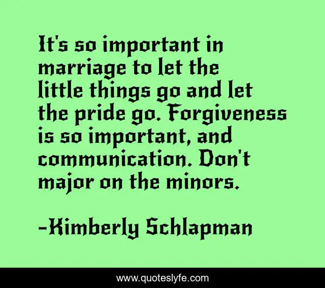 This page presents the quote "It's so important in marriage to let the little things go and let the pride go. Forgiveness is so important, and communication. Don't major on the minors.". Author of this quote is Kimberly Schlapman. This quote is about marriage, forgiveness,.