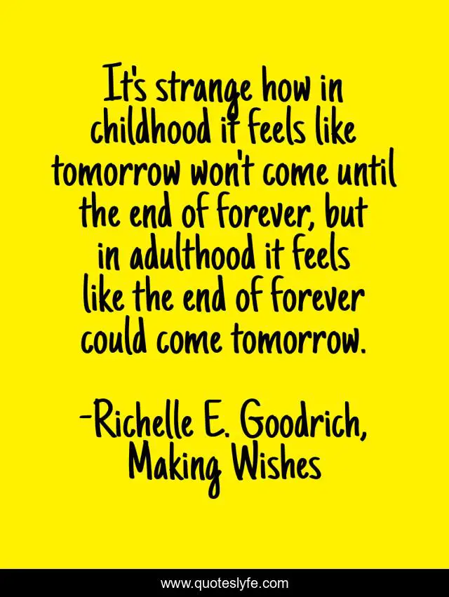 This page presents the quote "It's strange how in childhood it feels like tomorrow won't come until the end of forever, but in adulthood it feels like the end of forever could come tomorrow.". Author of this quote is Richelle E. Goodrich, Making Wishes. This quote is about aging, life, adulthood, richelle-e-goodrich, age, perception-of-time, youth, patience, richelle,.