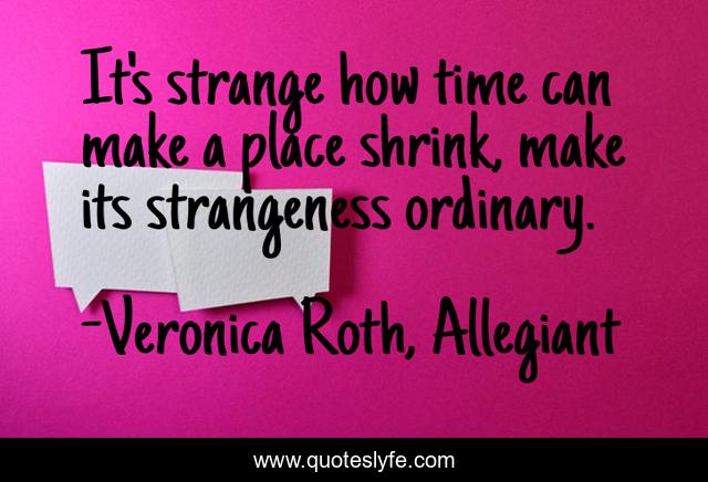 This page presents the quote "It's strange how time can make a place shrink, make its strangeness ordinary.". Author of this quote is Veronica Roth, Allegiant. This quote is about allegiant, strange, time,.