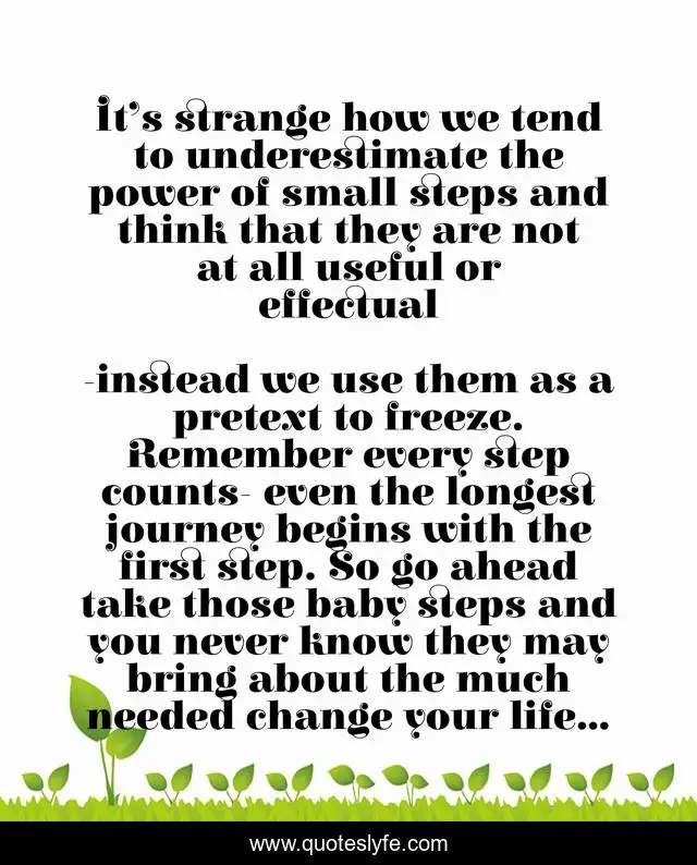 This page presents the quote "It’s strange how we tend to underestimate the power of small steps and think that they are not at all useful or effectual". Author of this quote is instead we use them as a pretext to freeze. Remember every step counts- even the longest journey begins with the first step. So go ahead take those baby steps and you never know they may bring about the much needed change your life…. .