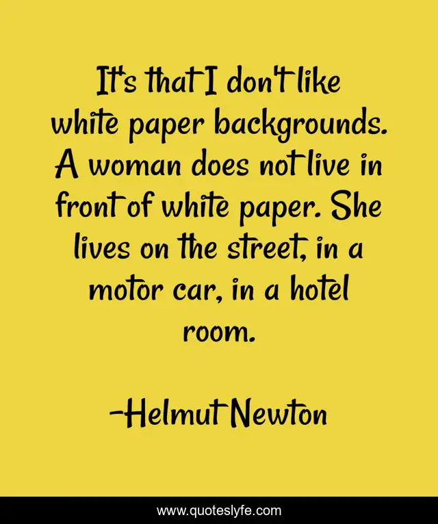 This page presents the quote "It's that I don't like white paper backgrounds. A woman does not live in front of white paper. She lives on the street, in a motor car, in a hotel room.". Author of this quote is Helmut Newton. This quote is about live, woman, hotel,.