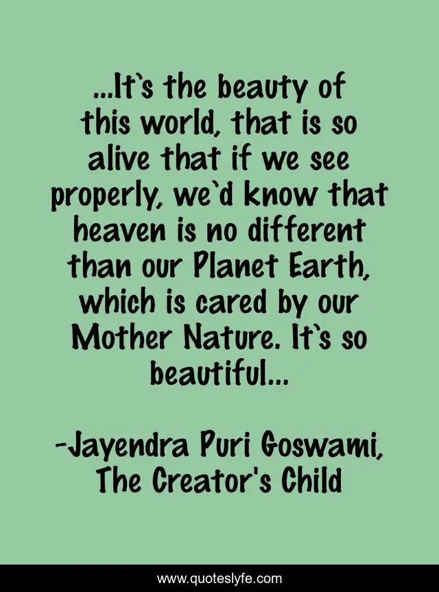 This page presents the quote "...It’s the beauty of this world, that is so alive that if we see properly, we’d know that heaven is no different than our Planet Earth, which is cared by our Mother Nature. It’s so beautiful…". Author of this quote is Jayendra Puri Goswami, The Creator's Child. This quote is about heaven, beauty, nature, mother, earth, world,.