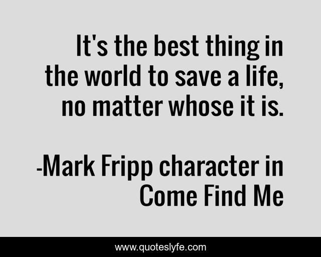 This page presents the quote "It's the best thing in the world to save a life, no matter whose it is.". Author of this quote is Mark Fripp character in Come Find Me. This quote is about true-love, first-love, love-story, romance-novels, military, love-stories, best-romance-books,.