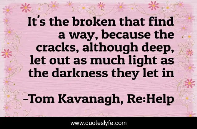 This page presents the quote "It's the broken that find a way, because the cracks, although deep, let out as much light as the darkness they let in". Author of this quote is Tom Kavanagh, Re:Help. This quote is about mental-health, young-adult-fiction,.