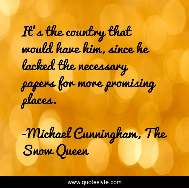 This page presents the quote "It’s the country that would have him, since he lacked the necessary papers for more promising places.". Author of this quote is Michael Cunningham, The Snow Queen. This quote is about country, papers,.