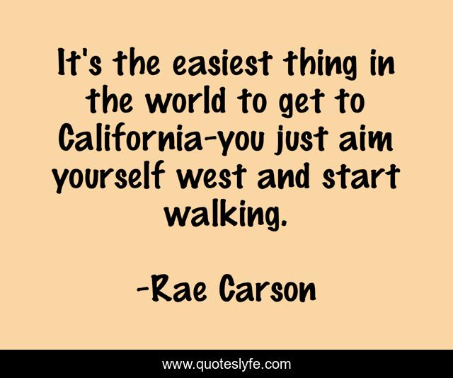 This page presents the quote "It's the easiest thing in the world to get to California-you just aim yourself west and start walking.". Author of this quote is Rae Carson. This quote is about rae-carson, gold, west, western-romance, walk-on-earth-a-stranger, california, western, world, seer,.