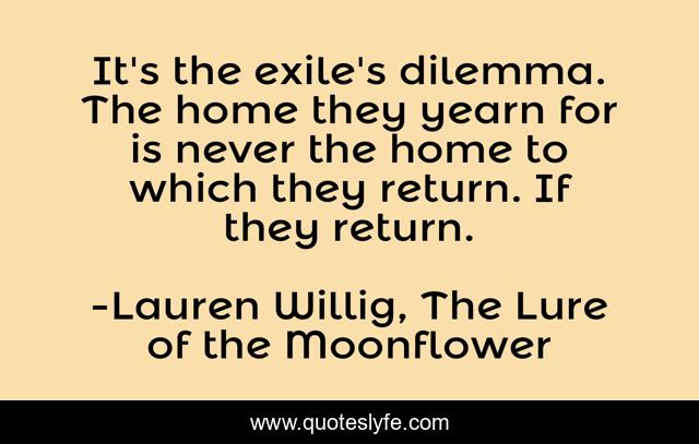 This page presents the quote "It's the exile's dilemma. The home they yearn for is never the home to which they return. If they return.". Author of this quote is Lauren Willig, The Lure of the Moonflower. This quote is about exile, home,.