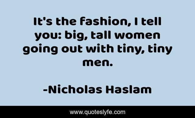 This page presents the quote "It's the fashion, I tell you: big, tall women going out with tiny, tiny men.". Author of this quote is Nicholas Haslam. This quote is about men, fashion, women,.
