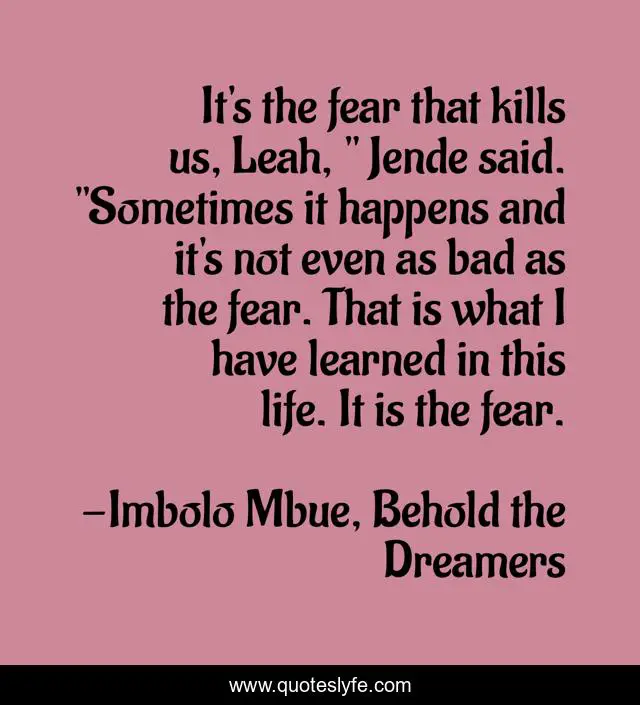 This page presents the quote "It's the fear that kills us, Leah, " Jende said. "Sometimes it happens and it's not even as bad as the fear. That is what I have learned in this life. It is the fear.". Author of this quote is Imbolo Mbue, Behold the Dreamers. This quote is about fear, death,.