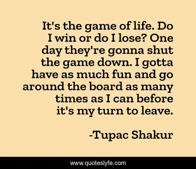 This page presents the quote "It's the game of life. Do I win or do I lose? One day they're gonna shut the game down. I gotta have as much fun and go around the board as many times as I can before it's my turn to leave.". Author of this quote is Tupac Shakur. This quote is about fun, game, day,.