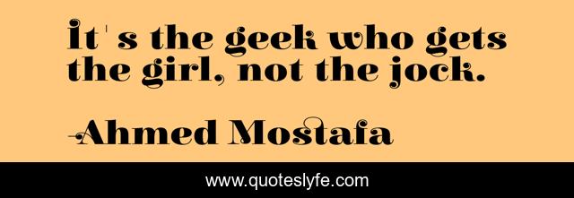 This page presents the quote "It's the geek who gets the girl, not the jock.". Author of this quote is Ahmed Mostafa. This quote is about reality-of-life, love, reality, geek, conflict, realization, winning, charming-men, affection,.