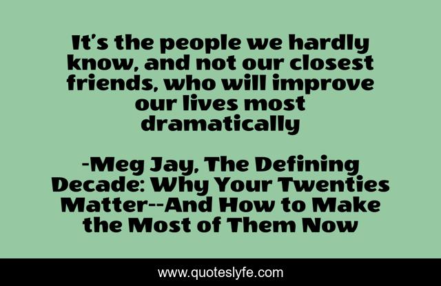 This page presents the quote "It’s the people we hardly know, and not our closest friends, who will improve our lives most dramatically". Author of this quote is Meg Jay, The Defining Decade: Why Your Twenties Matter--And How to Make the Most of Them Now. This quote is about relationships, life, love, career, work, connections, networking, friendships, affection,.