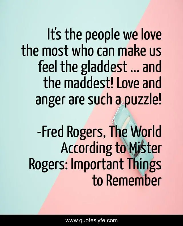 This page presents the quote "It's the people we love the most who can make us feel the gladdest ... and the maddest! Love and anger are such a puzzle!". Author of this quote is Fred Rogers, The World According to Mister Rogers: Important Things to Remember. This quote is about anger, mister-rogers, love, affection,.