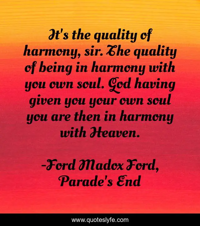 This page presents the quote "It's the quality of harmony, sir. The quality of being in harmony with you own soul. God having given you your own soul you are then in harmony with Heaven.". Author of this quote is Ford Madox Ford, Parade's End. This quote is about tietjens, harmony, quality-of-a-saint,.