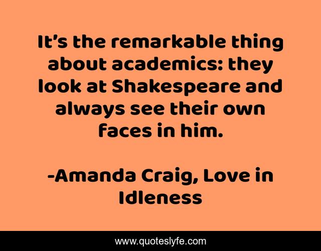 This page presents the quote "It’s the remarkable thing about academics: they look at Shakespeare and always see their own faces in him.". Author of this quote is Amanda Craig, Love in Idleness. This quote is about plays, academics, readers, midsummer-night-s-dream, academia, identification, shakespeare, projecting,.