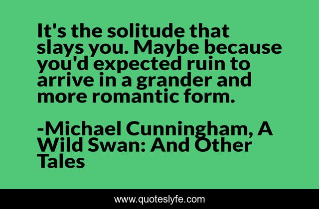 This page presents the quote "It's the solitude that slays you. Maybe because you'd expected ruin to arrive in a grander and more romantic form.". Author of this quote is Michael Cunningham, A Wild Swan: And Other Tales. This quote is about death, solitude,.