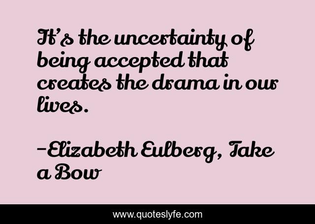 This page presents the quote "It’s the uncertainty of being accepted that creates the drama in our lives.". Author of this quote is Elizabeth Eulberg, Take a Bow. This quote is about drama, accepted, ethan, uncertainty,.