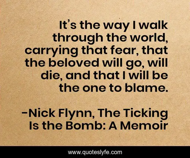 This page presents the quote "It’s the way I walk through the world, carrying that fear, that the beloved will go, will die, and that I will be the one to blame.". Author of this quote is Nick Flynn, The Ticking Is the Bomb: A Memoir. This quote is about blame, fault,.