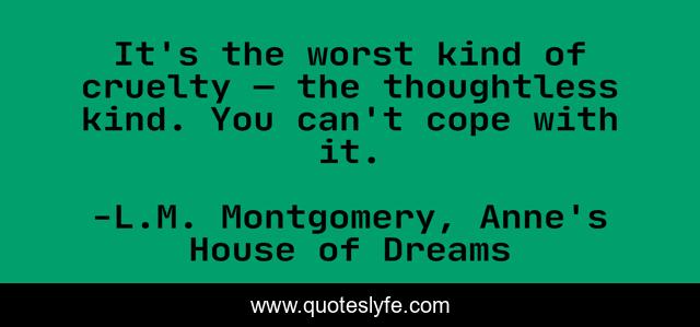 This page presents the quote "It's the worst kind of cruelty — the thoughtless kind. You can't cope with it.". Author of this quote is L.M. Montgomery, Anne's House of Dreams. This quote is about l-m-montgomery, cruelty,.