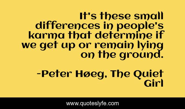 This page presents the quote "It's these small differences in people's karma that determine if we get up or remain lying on the ground.". Author of this quote is Peter Høeg, The Quiet Girl. This quote is about strength, people, differences, getting-up, determination, karma, determine, fall, small,.