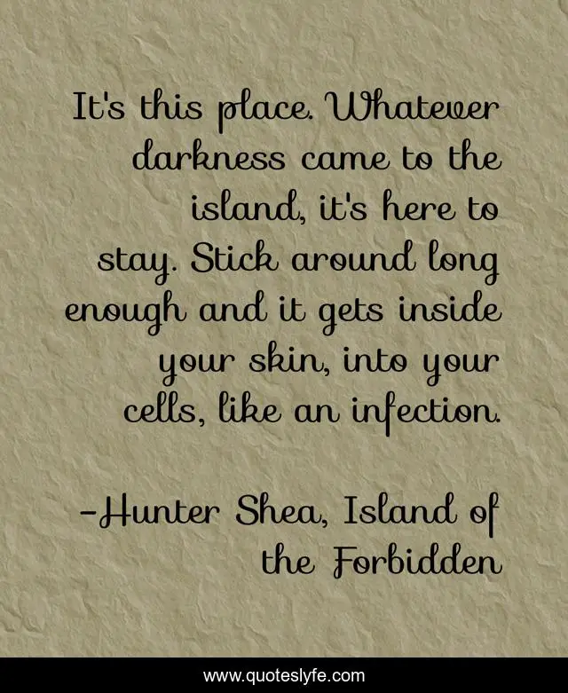 This page presents the quote "It's this place. Whatever darkness came to the island, it's here to stay. Stick around long enough and it gets inside your skin, into your cells, like an infection.". Author of this quote is Hunter Shea, Island of the Forbidden. This quote is about ghosts, ebs, horror, thriller, haunted-house,.