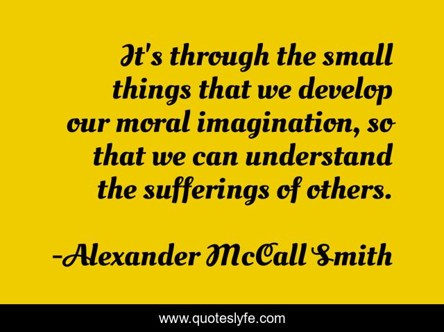 This page presents the quote "It's through the small things that we develop our moral imagination, so that we can understand the sufferings of others.". Author of this quote is Alexander McCall Smith. This quote is about small things, small, moral,.