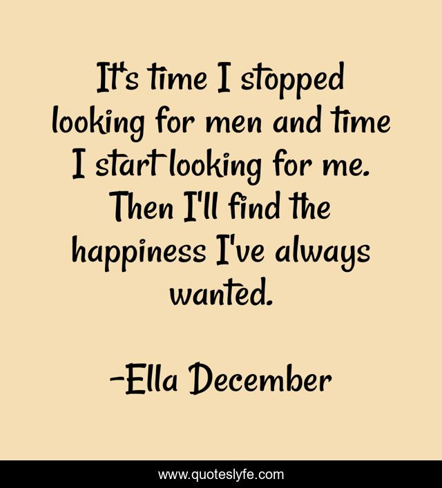 This page presents the quote "It's time I stopped looking for men and time I start looking for me. Then I'll find the happiness I've always wanted.". Author of this quote is Ella December. This quote is about dirty-diamonds, ella-december, romance-novels,.