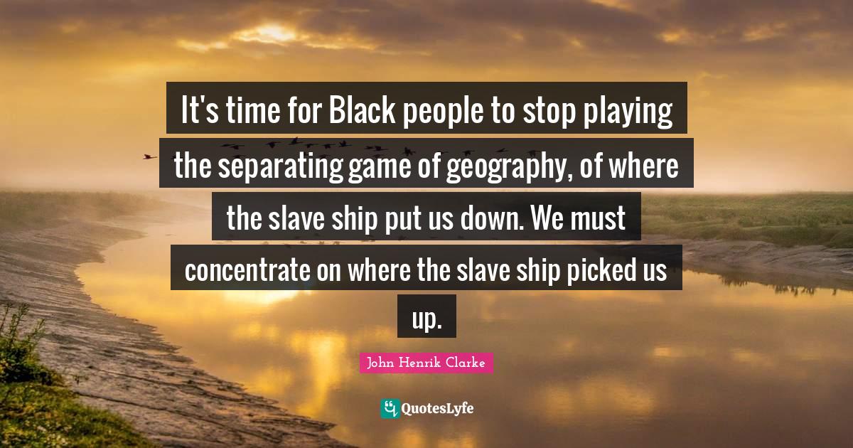 This page presents the quote "It's time for Black people to stop playing the separating game of geography, of where the slave ship put us down. We must concentrate on where the slave ship picked us up.". Author of this quote is John Henrik Clarke. This quote is about black people, slave, games, time, geography, people, slave ships, separating,.