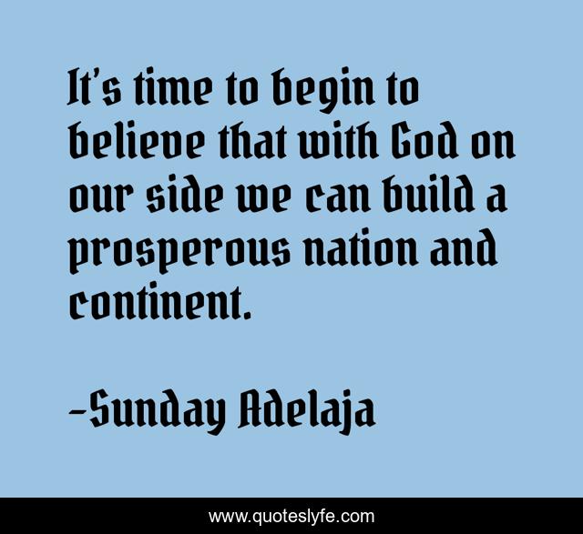 This page presents the quote "It’s time to begin to believe that with God on our side we can build a prosperous nation and continent.". Author of this quote is Sunday Adelaja. This quote is about believe, continent, nation,.