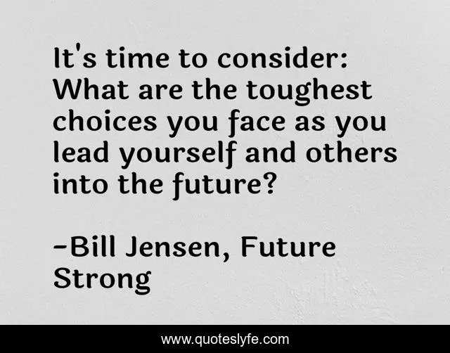 This page presents the quote "It's time to consider: What are the toughest choices you face as you lead yourself and others into the future?". Author of this quote is Bill Jensen, Future Strong. This quote is about enthusiasm, future, leadership, inspirational, self-help,.