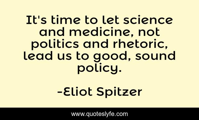 This page presents the quote "It's time to let science and medicine, not politics and rhetoric, lead us to good, sound policy.". Author of this quote is Eliot Spitzer. This quote is about politics, good, time,.