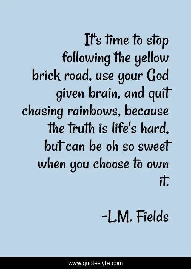 This page presents the quote "It's time to stop following the yellow brick road, use your God given brain, and quit chasing rainbows, because the truth is life's hard, but can be oh so sweet when you choose to own it.". Author of this quote is L.M. Fields. This quote is about life-lesson, truth, inspiration,.