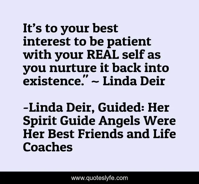 This page presents the quote "It’s to your best interest to be patient with your REAL self as you nurture it back into existence." ~ Linda Deir". Author of this quote is Linda Deir, Guided: Her Spirit Guide Angels Were Her Best Friends and Life Coaches. This quote is about spirit-guide, guided, angels, best-friends,.