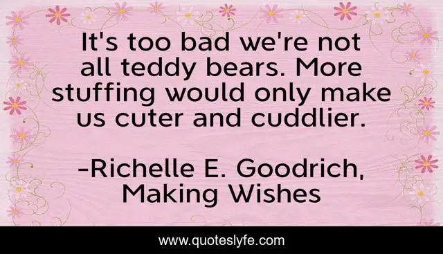 This page presents the quote "It's too bad we're not all teddy bears. More stuffing would only make us cuter and cuddlier.". Author of this quote is Richelle E. Goodrich, Making Wishes. This quote is about cute, stuffing, stout, richelle-e-goodrich, fat, cuddly, cuddlier, richelle, pudgy,.