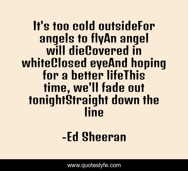 This page presents the quote "It's too cold outsideFor angels to flyAn angel will dieCovered in whiteClosed eyeAnd hoping for a better lifeThis time, we'll fade out tonightStraight down the line". Author of this quote is Ed Sheeran. This quote is about a, ed, drug, addict, team, the, angels, white, sheeran,.