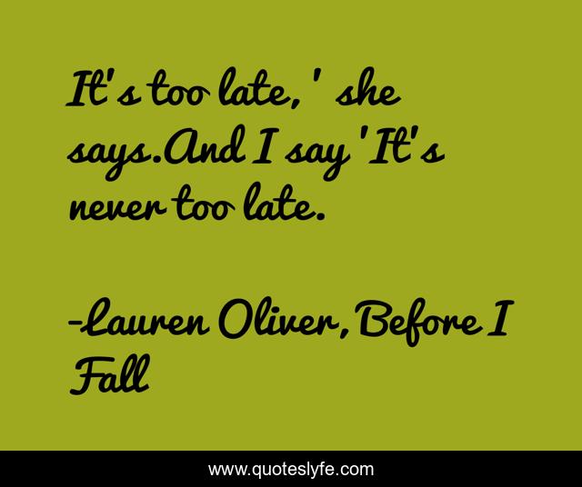 This page presents the quote "It's too late, ' she says.And I say 'It's never too late.". Author of this quote is Lauren Oliver, Before I Fall. This quote is about before-i-fall, motivation,.