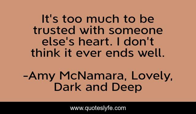 This page presents the quote "It's too much to be trusted with someone else's heart. I don't think it ever ends well.". Author of this quote is Amy McNamara, Lovely, Dark and Deep. This quote is about broken-heart, love, affection, hurt,.