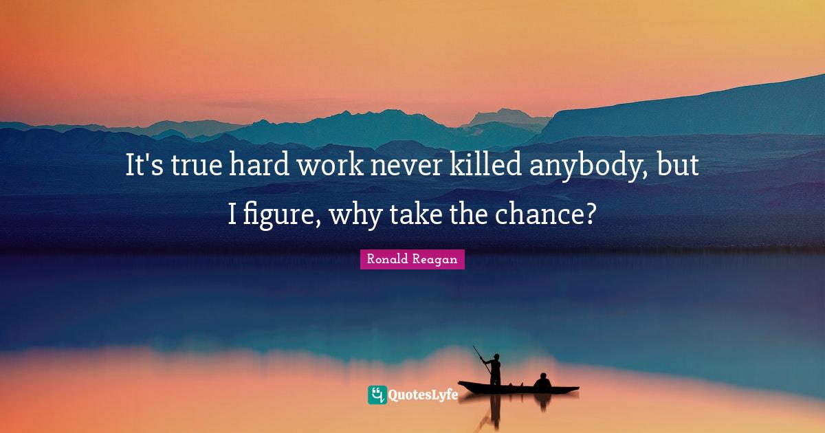 This page presents the quote "It's true hard work never killed anybody, but I figure, why take the chance?". Author of this quote is Ronald Reagan. This quote is about chance, why, hard work,.