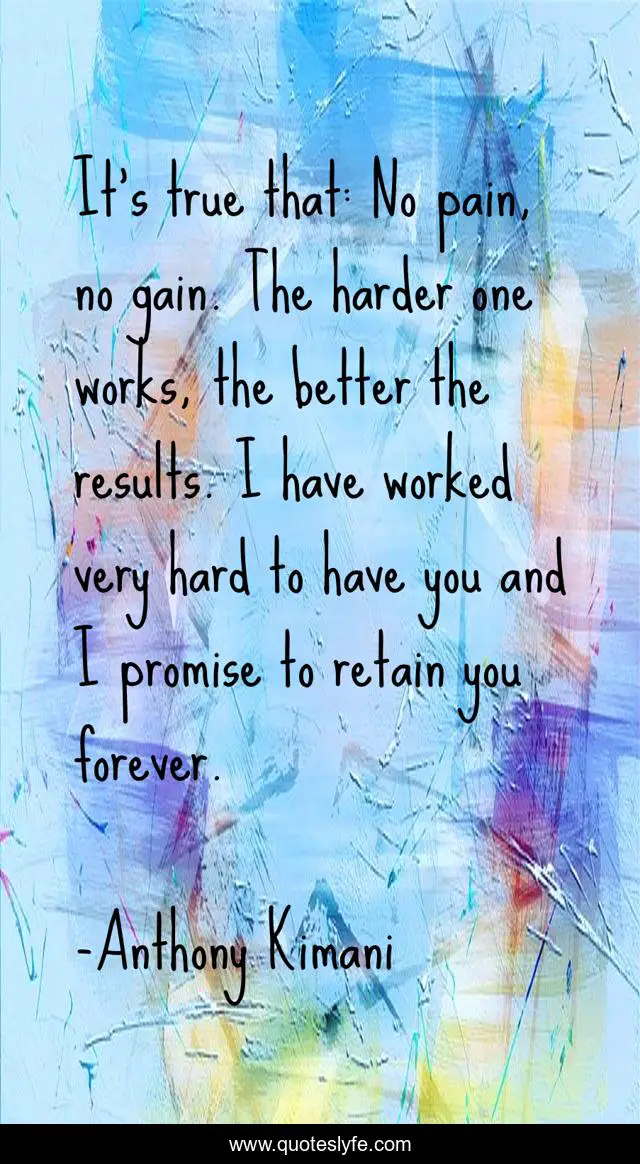 This page presents the quote "It's true that: No pain, no gain. The harder one works, the better the results. I have worked very hard to have you and I promise to retain you forever.". Author of this quote is Anthony Kimani. This quote is about love, affection,.
