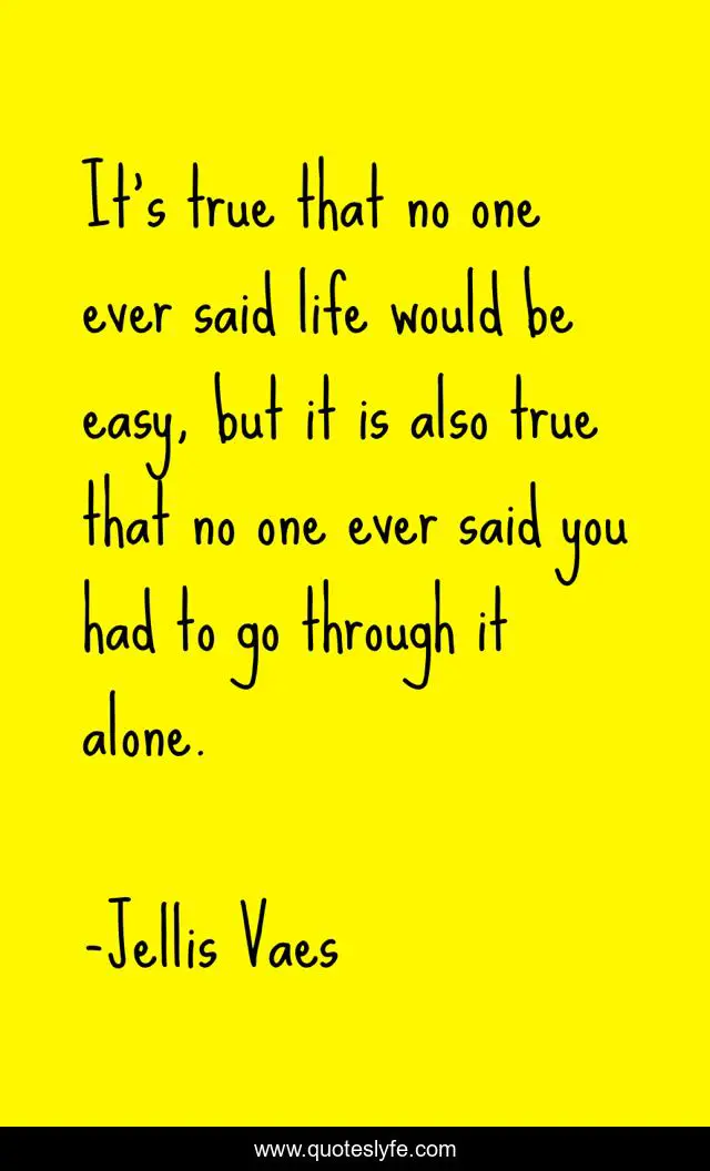 This page presents the quote "It’s true that no one ever said life would be easy, but it is also true that no one ever said you had to go through it alone.". Author of this quote is Jellis Vaes. This quote is about hard-times, jellis-vaes, life, hardship, life-lessons,.
