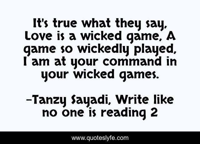 This page presents the quote "It's true what they say, Love is a wicked game, A game so wickedly played, I am at your command in your wicked games.". Author of this quote is Tanzy Sayadi, Write like no one is reading 2. This quote is about love, games, truth, command, true, affection, wicked,.