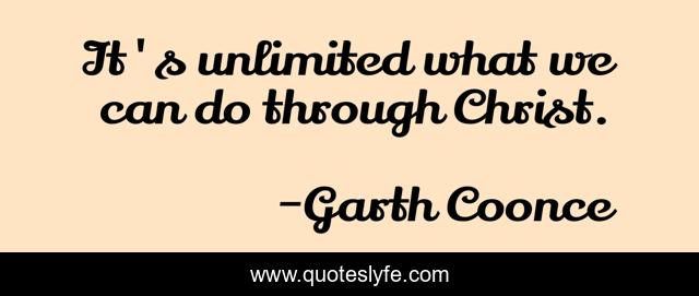 This page presents the quote "It's unlimited what we can do through Christ.". Author of this quote is Garth Coonce. This quote is about faith, christianity, jesus, spirituality, religion,.