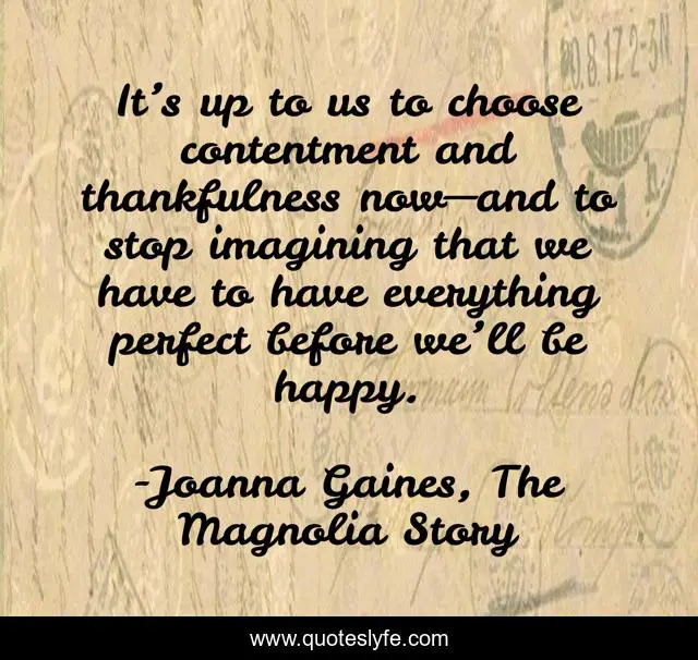 This page presents the quote "It’s up to us to choose contentment and thankfulness now—and to stop imagining that we have to have everything perfect before we’ll be happy.". Author of this quote is Joanna Gaines, The Magnolia Story. This quote is about gratitude, contentment,.