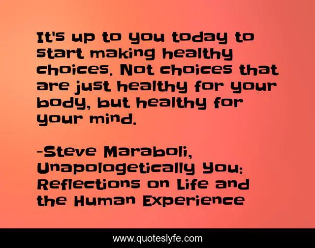 This page presents the quote "It's up to you today to start making healthy choices. Not choices that are just healthy for your body, but healthy for your mind.". Author of this quote is Steve Maraboli, Unapologetically You: Reflections on Life and the Human Experience. This quote is about confidence, healthy, positive, motivational, choices, mental-health, optimistic, inspirational, enthusiasm,.