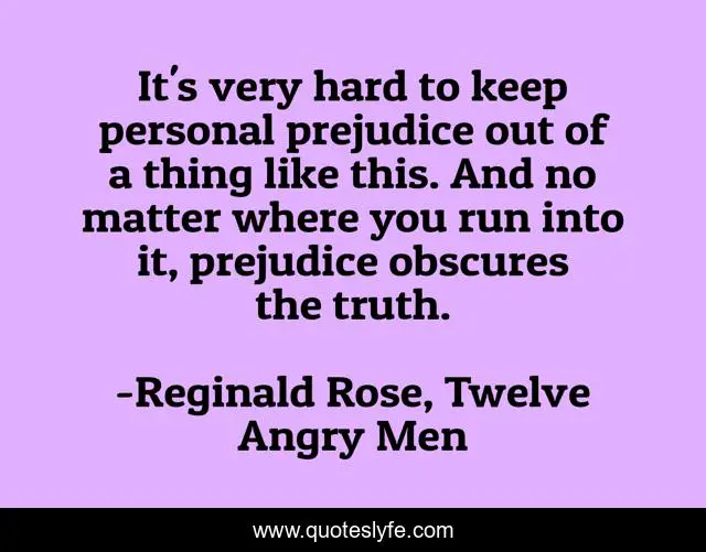 This page presents the quote "It's very hard to keep personal prejudice out of a thing like this. And no matter where you run into it, prejudice obscures the truth.". Author of this quote is Reginald Rose, Twelve Angry Men. This quote is about prejudice, truth, evidence,.