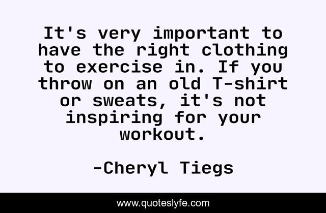 This page presents the quote "It's very important to have the right clothing to exercise in. If you throw on an old T-shirt or sweats, it's not inspiring for your workout.". Author of this quote is Cheryl Tiegs. This quote is about clothing, exercise,.