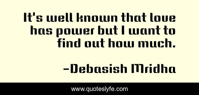 This page presents the quote "It's well known that love has power but I want to find out how much.". Author of this quote is Debasish Mridha. This quote is about life, love, knowledge, inspirational, intelligence, philosophy, wisdom, quotes, affection,.