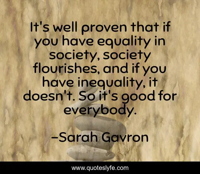 This page presents the quote "It's well proven that if you have equality in society, society flourishes, and if you have inequality, it doesn't. So it's good for everybody.". Author of this quote is Sarah Gavron. This quote is about society, good, inequality,.
